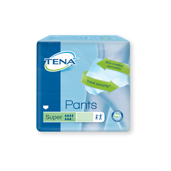 Tena Pants Super, majtki chłonne - produkt chłonny zalecany do codziennego stosowania przy średnim i ciężkim nietrzymaniu moczu (poziom chłonności 7/8). Przeznaczone są dla osób chodzących czy poruszających się choćby po domu. Dzięki systemom FeelDry i Odour Neutralizer zapewniają suchość i neutralizują nieprzyjemny zapach. Zakładane są jak zwykła bielizna i zapewniają komfort oraz dyskrecję. Przylegają do ciała, dzięki czemu nie odznaczają się pod ubraniem. W przypadku wycieku moczu, majtki TENA Pants chłoną go do wnętrza układu chłonnego oraz utrzymują go w jego wnętrzu dzięki specjalnemu superabsorbentowi, jednocześnie zabezpieczając przed wydostaniem się nieprzyjemnego zapachu na zewnątrz.