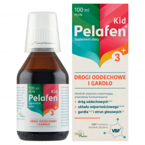 Pelafen Kid 3+ - suplement diety zawierający składniki wspierające prawidłowe funkcjonowanie dróg oddechowych i gardła oraz odporność. Preparat przeznaczony dla dzieci powyżej 3 roku życia.
