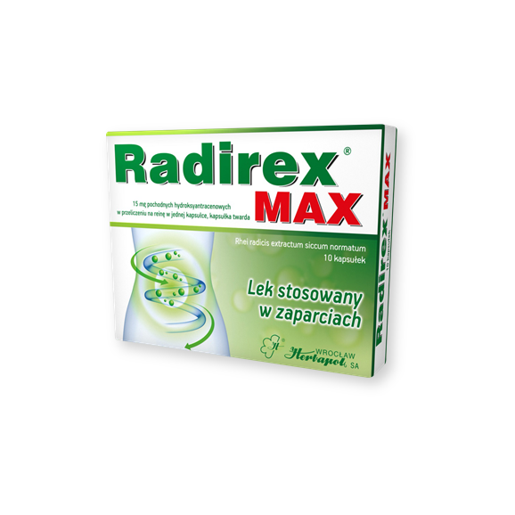 Radirex MAX to produkt leczniczy o działaniu przeczyszczającym do stosowania w sporadycznych zaparciach. Działanie Radirexu wynika z obecności pochodnych antracenowych - m.in. reiny.