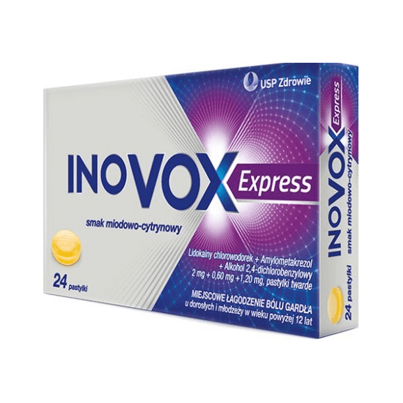 Inovox Express, smak miodowo-cytrynowy, jest lekiem w postaci żółtych, wypukłych z obu stron pastylek twardych, który zawiera antyseptyki: 1,2 mg alkoholu 2,4-dichlorobenzylowego i 0,6 mg amylometakrezolu, oraz środek miejscowo znieczulający do gardła - 2 mg chlorowodorku lidokainy. Preparat ten stosuje się w celu miejscowego antyseptycznego leczenia stanów zapalnych gardła i jamy ustnej (objawiających się m.in. zaczerwienieniem i obrzękiem). Lek Inovox Express jest odpowiedni dla osób dorosłych oraz młodzieży powyżej 12. roku życia.