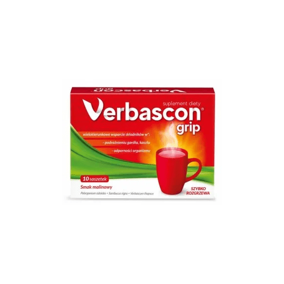 Verbascon Grip to suplement diety w postaci proszku do sporządzenia zawiesiny o smaku malinowym, do stosowania szczególnie w okresie jesienno-zimowym. Kompozycja preparatu Verbascon Grip, oparta jest o działanie składników pochodzenia naturalnego, takich jak: ekstrakt z korzenia pelargonii afrykańskiej, ekstrakt z kwiatu czarnego bzu oraz ekstrakt z kwiatu dziewanny, które pomagają łagodzić problemy układu oddechowego, takie jak kaszel i dolegliwości gardła. Ponadto skład został wzbogacony o witaminę C, cynk, selen, jak również rutynę.