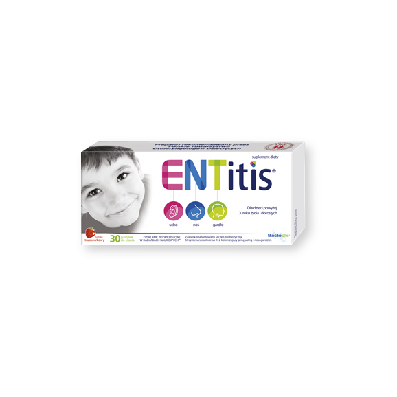 ENTitis - suplement diety zawierający w składzie specyficzny szczep Streptococcus salivarius K12. Produkt przeznaczony dla osób dorosłych i dzieci powyżej 3 roku życia.