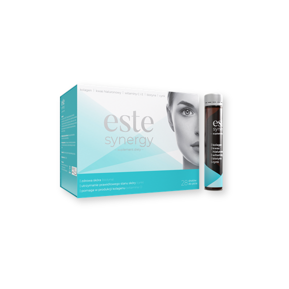 Este Synergy - suplement diety, specjalna kompozycja kolagenu, kwasu hialuronowego wzbogaconych witaminami C i E, cynkiem oraz biotyną. Wraz z wiekiem organizm produkuje coraz mniej kolagenu. Zastosowany w Este Synergy Verisol P to opatentowany i przebadany kolagen. Zauważalne zmniejszenie napięcia i elastyczności skóry. Opakowanie zawiera 28 sztuk.