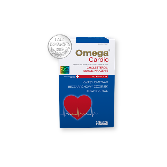 Omega Cardio + czosnek - suplement diety, zawierający kwasy omega-3, resweratrol oraz czosnek bezzapachowy, które wspomagają funkcjonowanie serca, krążenia oraz pomagają utrzymać właściwy poziom cholesterolu. Produkt przeznaczony dla osób dorosłych.
