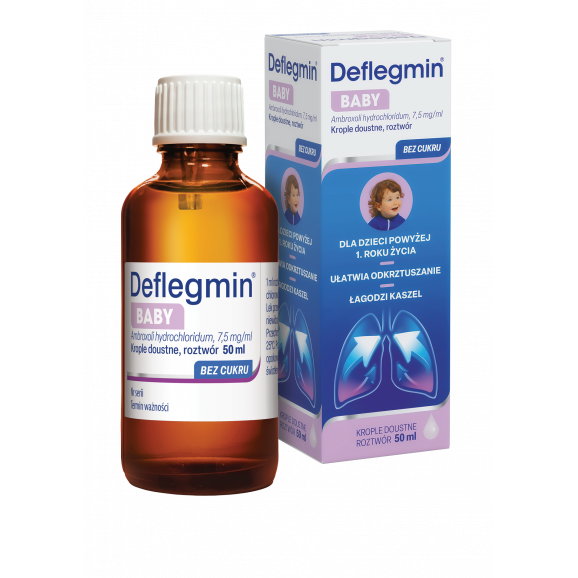 Deflegmin Baby to produkt leczniczy ułatwiający transport zalegającej wydzieliny w drogach oskrzelowych, wspomaga odkrztuszanie, łagodzi mokry kaszel. Lek przeznaczony dla dzieci od 1 roku życia.