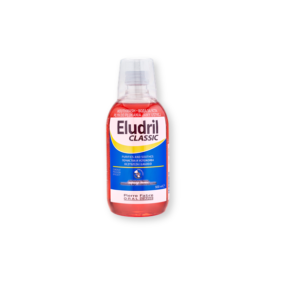 - Eludril classic, oczyszczający i łagodzący płyn do płukania jamy ustnej, który wspomaga utrzymanie prawidłowej higieny jamy ustnej.