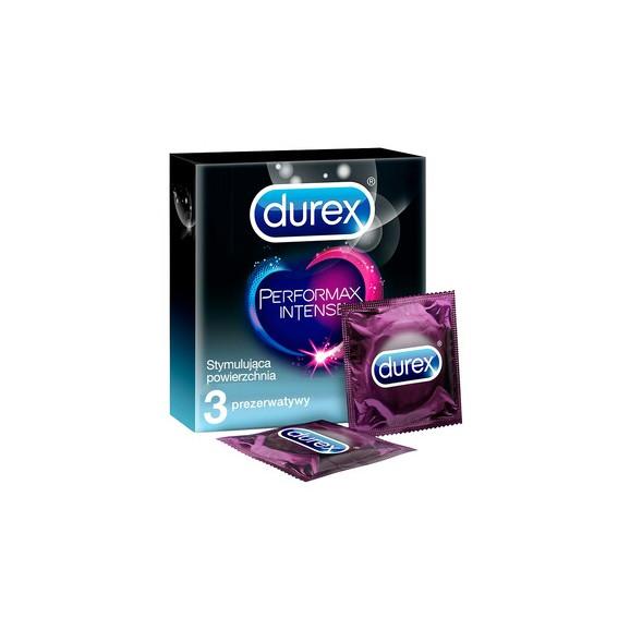 Wyrób medyczny Durex Performax Intense to 3 prezerwatywy pokryte specjalnym lubrykantem z benzokainą (5%), która przedłuża trwanie stosunku i dostarcza jeszcze bardziej intensywnych doznań obojgu partnerom. Zaprojektowane by wspólnie osiągnąć orgazm - dla niego lubrykant przedłużający trwanie stosunku, dla niej prążkowana powierzchnia z wypustkami, która potęguje orgazm. Przezroczyste prezerwatywy o kształcie Easy-On, zakończone zbiorniczkiem. Wykonane z naturalnej gumy lateksowej.