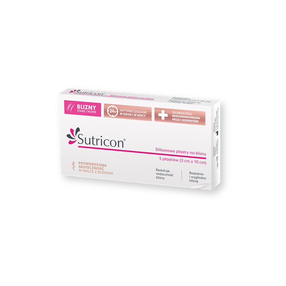 - Plaster silikonowy Sutricon pozytywnie wpływa na poprawę wyglądu i elastyczności blizn. Innowacyjna struktura, zawierająca wysokiej jakości farmaceutyczny żel silikonowy, posiada właściwości zbliżone do zdrowej ludzkiej skóry: elastyczność, przepuszczalność tlenu i zapobieganie procesowi nadmiernej przeznaskórkowej utracie wody. Dzięki tym cechom plastry silikonowe na blizny redukują dyskomfort związany z blizną, taki jak ból, swędzenie czy uczucie ciągnięcia.
