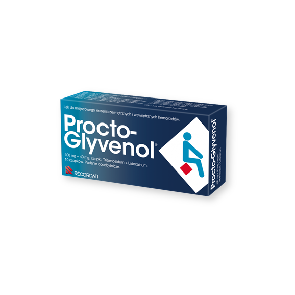 Czopki doobytnicze Procto-Glyvenol to lek na hemoroidy, zawierający dwa składniki aktywne o uzupełniającym się działaniu. Zawarty w leku tribenozyd zmniejsza stan zapalny, obrzęk oraz świąd. Dodatek lidokaniy w czopkach powoduje miejscowe znieczulenie. Czopki można stosować u osób dorosłych oraz od 4 miesiąca ciąży i podczas laktacji.