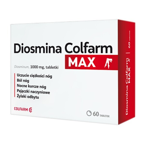 Diosmina Colfarm Max to lek zawierający zmikronizowaną diosminę. Lek stosuje się w przypadku objawów takich jak uczucie ciężkich nóg, bólu nóg, nocnych kurczy nóg. Diosmina zmniejsza również podatność naczynek krwionośnych na pękanie.