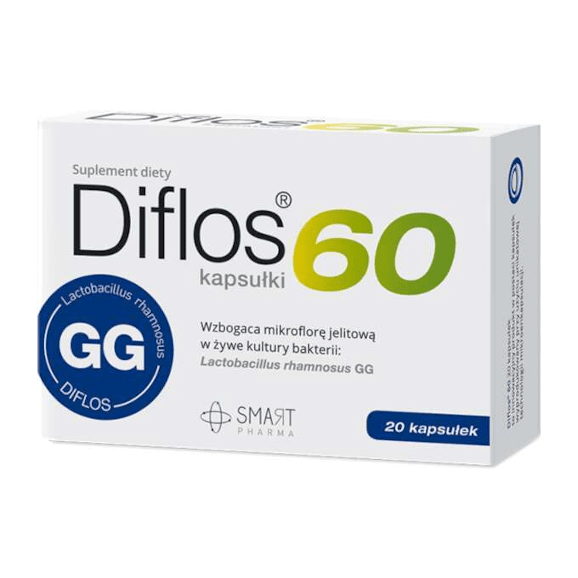 Diflos 60 to preparat probiotyczny w postaci kapsułek, zawierający mikroenkapsulowane, żywe kultury bakterii Lactobacillus rhamnosus GG.
