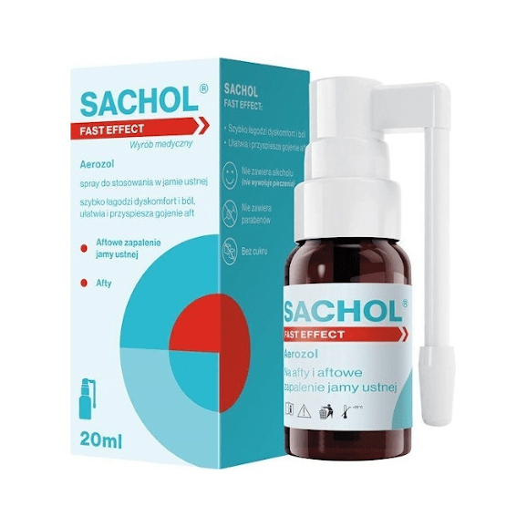 Sachol Fast Effect to wyrób medyczny w formie sprayu w butelce z dozownikiem. Przeznaczony jest do stosowania w jamie ustnej, łagodzi dyskomfort i ból związany z aftami i aftowym zapaleniem jamy ustnej, a także przyspiesza gojenie aft. Sachol Fast Effect nie zawiera alkoholu (nie powoduje pieczenia), parabenów oraz cukru. Wykazuje skuteczne działanie barierowe, pozwalając na szybkie zmniejszenie bólu towarzyszącego aftom i owrzodzeniom. Ma przyjemny, miętowy aromat. Butelka z dozownikiem pozwala na szybką i higieniczną aplikację produktu.