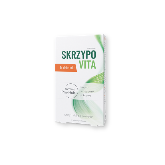 Skrzypovita 1x dziennie - kompozycja składników, wpływających na zdrowie włosów i mocne paznokcie oraz pomagających zachować zdrowy i piękny wygląd skóry. Formuła PRO-HAIR to kompozycja witamin i ziół w dobranych proporcjach, pozytywnie wpływających na zdrowie włosów i paznokci. Zawiera naturalne wyciągi ze skrzypu polnego i pokrzywy stosowane w tradycyjnej pielęgnacji włosów oraz skóry. Wzbogacona jest w biotynę, zwaną "witaminą piękności", która wpływa na właściwe funkcjonowanie skóry oraz pobudzenie wzrostu włosów.
