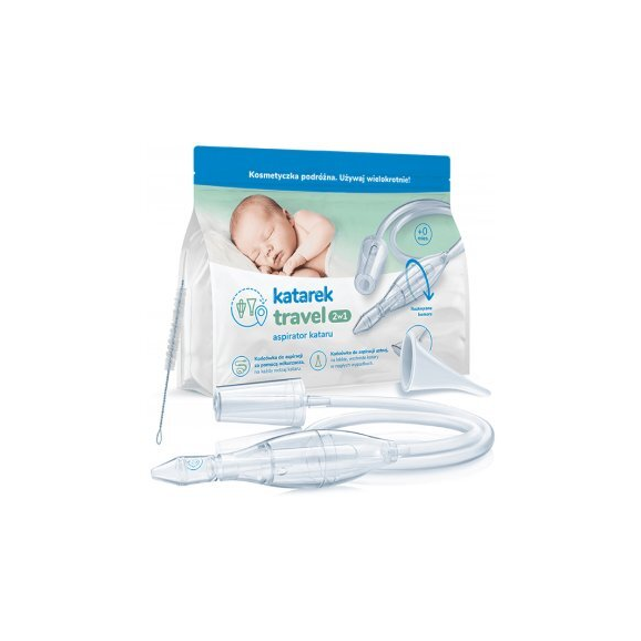 Katarek Travel to rozwiązanie 2w1 do aspiracji ustnej i do odkurzacza u dzieci od 1 dnia życia. Korzystanie z aspiratora jest o tyle istotne, że zalegająca wydzielina może powodować dyskomfort i prowadzić do poważnych problemów zdrowotnych nosa, uszu, gardła i dróg oddechowych. Wersja do odkurzacza poradzi sobie z gęstym i zalegającym katarem. W podróży, na spacerze kiedy nie ma możliwości użycia odkurzacza z pomocą przychodzi wersja ustna aspiratora, która sprawdzi się także w codziennej pielęgnacji. Opakowanie w formie kosmetyczki to praktyczne rozwiązanie w podróży.