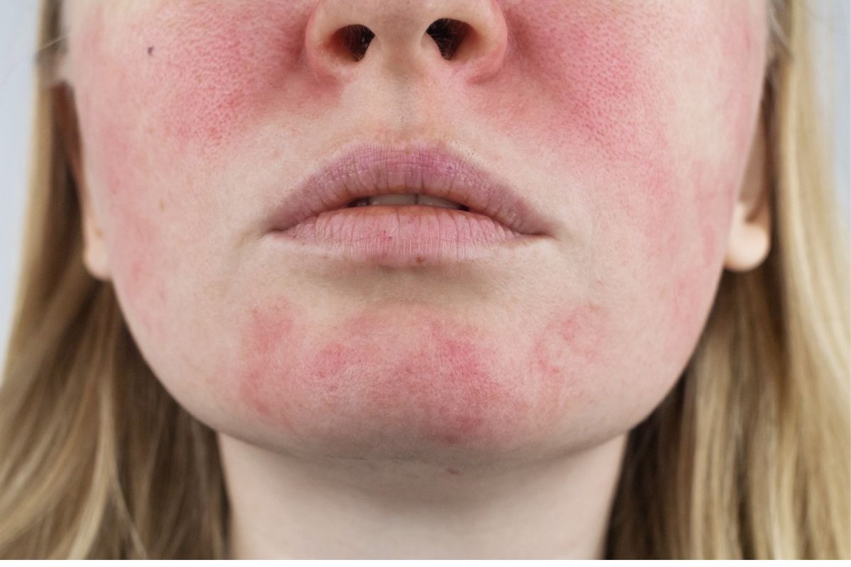 Lokalizacja na twarzy: Rumień najczęściej występuje na twarzy, zwłaszcza na policzkach, czole, brodzie oraz wokół nosa. Skóra może być ciepła i lekko napięta w miejscach, gdzie pojawia się zaczerwienienie.